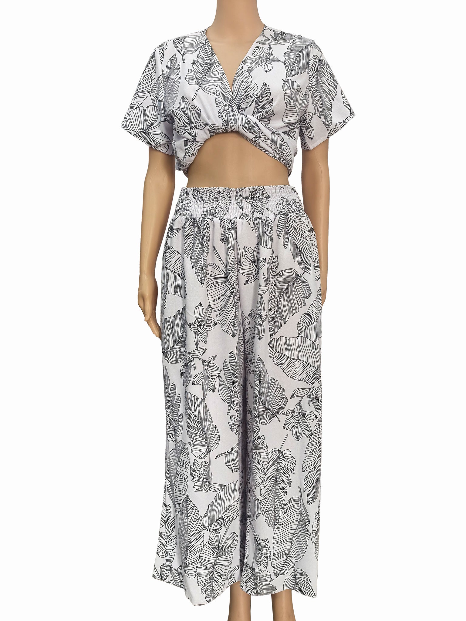N91-P2590(White Leaf), Ladies Crepe 100% Polyester Palazzo Pants with Smock Waist